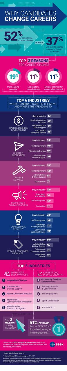 A SEEK study has revealed 52% of New Zealand employees are considering making a career change in the future. Find out why candidates are looking to change jobs and where they intend on going to in the infographic below.