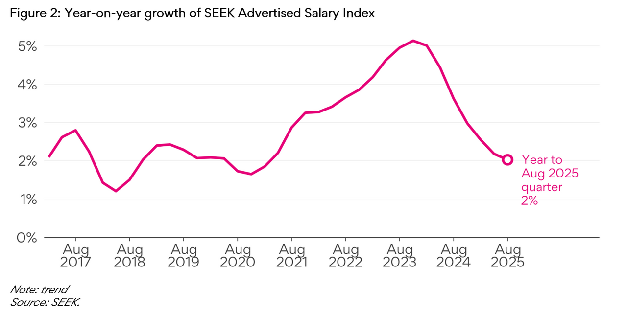 Annual advertised salary growth slowed to 2.0% y/y in August, this has now declined 3.1ppt since 2023.