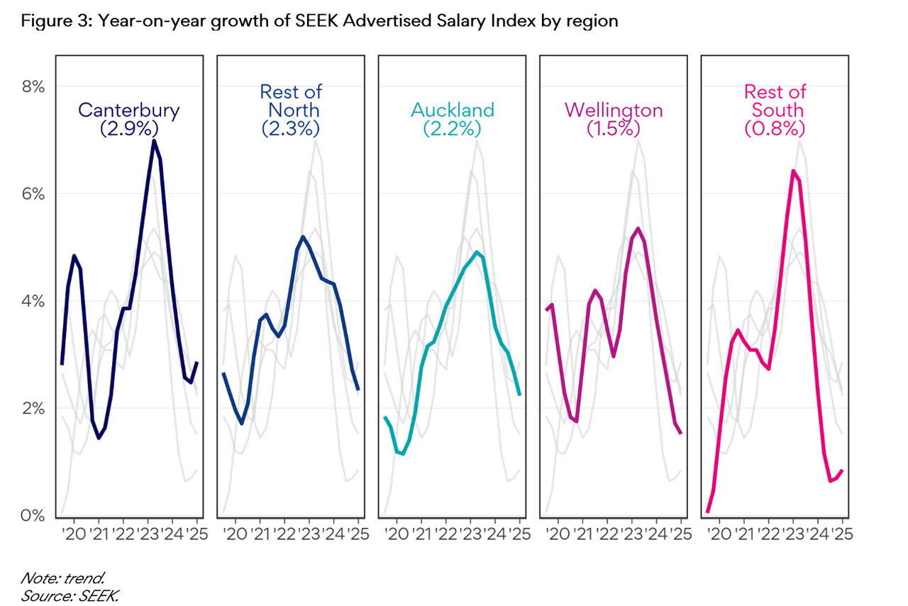 Quarterly and annual average advertised salary growth was fastest in Canterbury at 1.0% q/q and 2.9% y/y.