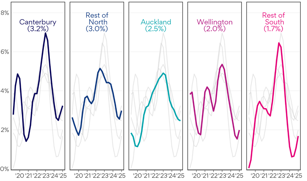 The South Island outside of Canterbury, despite an acceleration, continues to experience some of the slowest advertised salary growth, with the Rest of the South Island having the slowest quarterly and annual growth rates.
