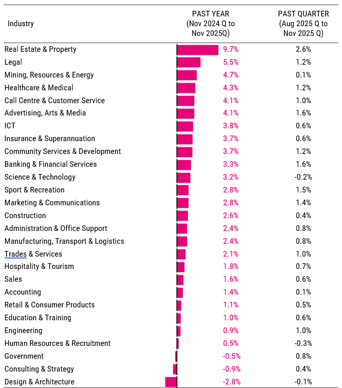 The Real Estate & Property industry had the fastest advertised salary growth over the year to August (9.7% y/y), with strong growth of 2.6% in the three months to November.