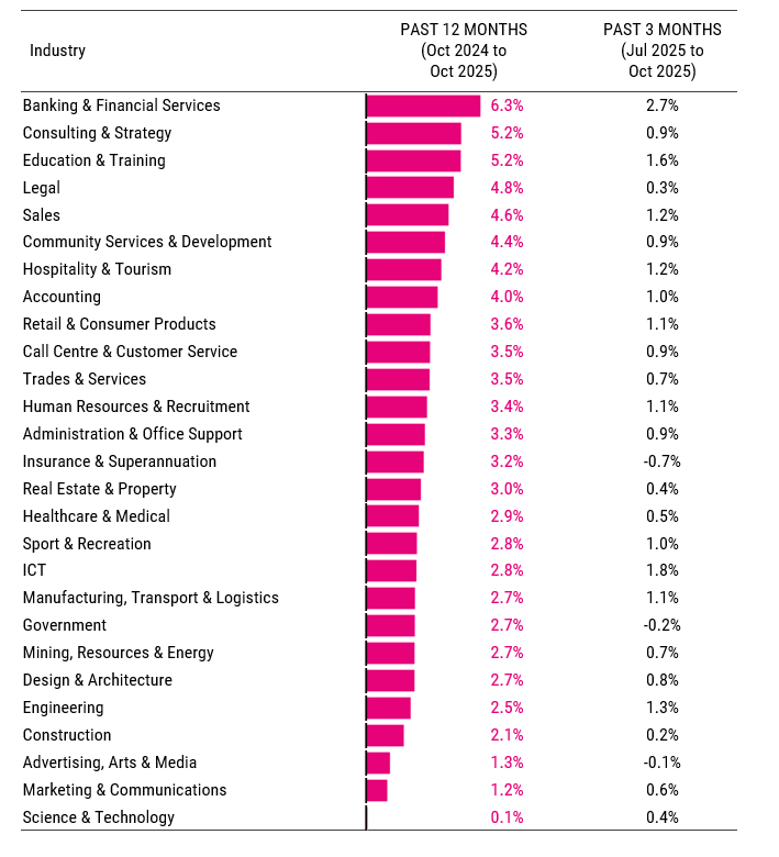 Advertised salary growth for Consulting & Strategy remains faster than most industries over the year to October (5.2%). Some modest declines in advertised salaries have occurred between some months this year in the industry, but they are much smaller than in 2024.