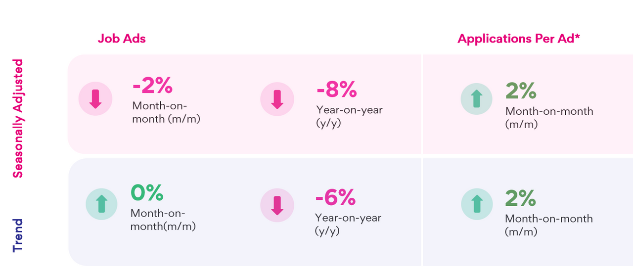 Job ads fell 2% m/m, seasonally adjusted, and are 8% lower y/y.