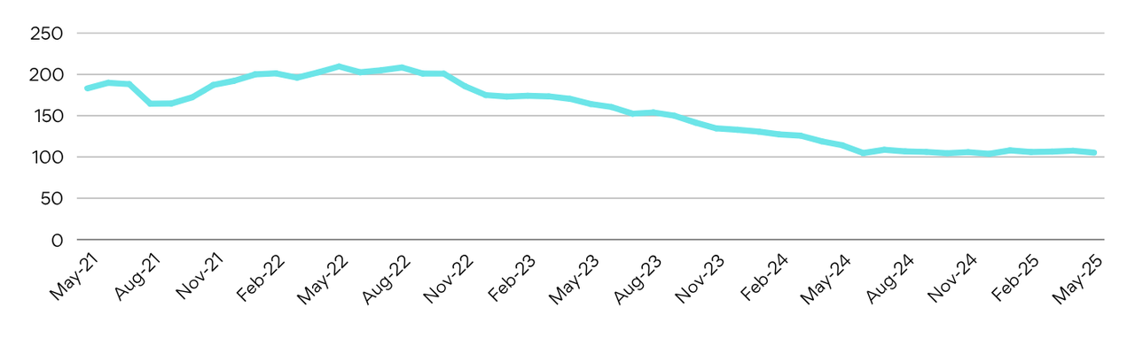 Figure 2: National SEEK job ad change over time – May 2021 to May 2025. Index = 100 (2013 average)
