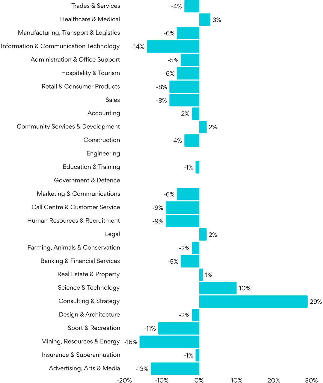 Quarterly ad volume rises illuminates further pockets of growth in the Public, Professional Services and Construction sectors, with notable quarter-on-quarter increases in Education & Training (11%), Human Resources & Recruitment (5%) and Trades & Services (2%) among others.