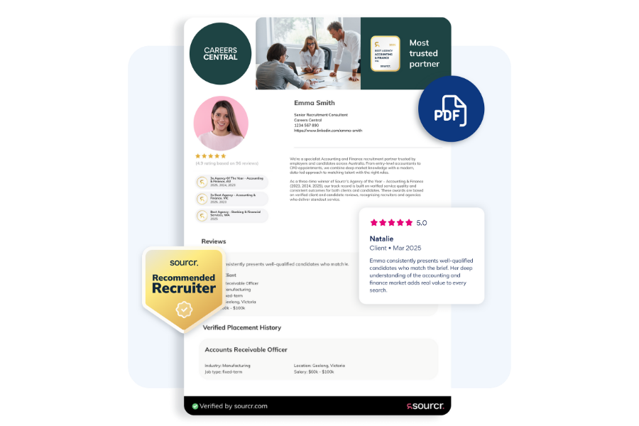 Your Recruiter Profile is a dedicated space on SEEK to showcase your verified reviews, star ratings, past placements, awards, and live job opportunities.